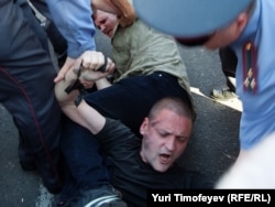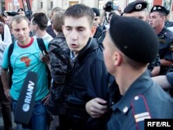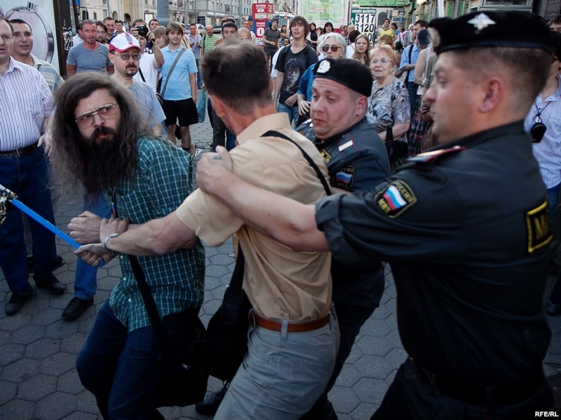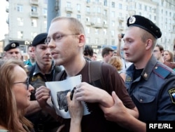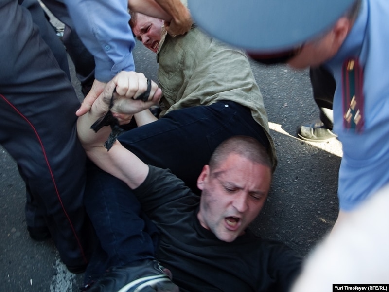 Как только Сергей Удальцов и его соратники достали "черные метки" для Юрия Лужкова, сотрудники милиции приступили к задержанию.