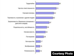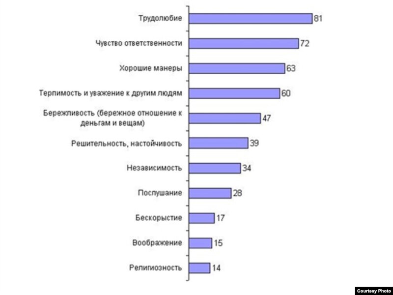 Чему учит семья? - так называется исследование социологической компании «Башкирова и партнеры». Респондентам было предложено выбрать из списка пять самых важных качеств, которые можно воспитать у ребенка в семье. Как выяснилось, по мнению россиян, самым главным из этих качеств является трудолюбие, его назвали более восьмидесяти процентов опрошенных. На втором месте - чувство ответственности, на третьем – хорошие манеры. Далее следуют терпимость и уважение к другим людям - их сочли важными шестьдесят процентов граждан. А вот бескорыстие, воображение и религиозность занимают в этом списке три последних места, то есть считаются наименее важными. Социологи отмечают, что у россиян нет единого представления о воспитании детей. В данном случае это видно из отношения респондентов к таким противоположным качествам, как послушание и независимость: тридцать четыре процента желали бы воспитывать в своих детях независимость, а двадцать восемь процентов хотят, чтобы дети были послушными.
