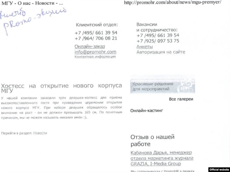 Когда корреспондент Радио Свобода позвонила в компанию PromoHR, чтобы конкретизировать это радостное для репутации компании известие (заказчик, цена заказа), вежливый, судя по его "здравствуйте", оператор сказал, что ничем не может помочь и бросил трубку. Через несколько минут новость с сайта компании исчезла, но осталась в распечатанном виде в редакции РС, также ее запомнил Гугл. Адрес у новости был – www.promohr.com/about/news/mgu-premyer/