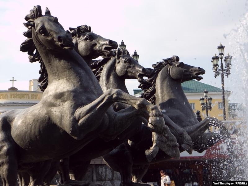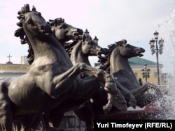 Лошади, символизирующие времена года, скачут по направлению к Кремлю. Композиция в Александровском саду
