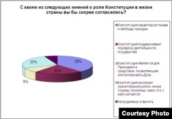 По данным Левада-центра, три четверти россиян знают, какой праздник отмечается 12 декабря. А вот по поводу роли самой Конституции в жизни страны мнения разделились. Большая часть опрошенных – 38 процентов – считают, что она гарантирует права и свободы граждан, 22 процента – что она поддерживает порядок в деятельности государства, 8 процентов уверены, что Конституция является для президента средством, позволяющим контролировать Госдуму. А каждый четвертый отмечают, что Конституция не играет важной роли в жизни страны, поскольку с ней мало кто считается.