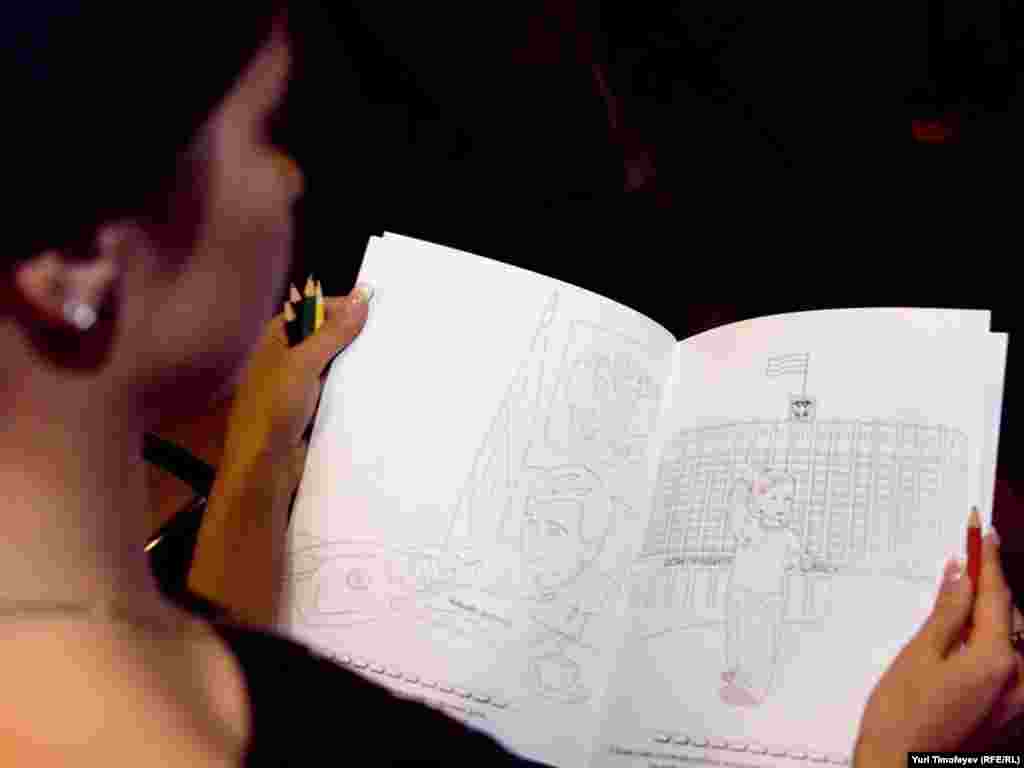 Девушки раздали журналистам по раскраске и пачке карандашей...