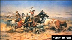 Александр Генис: Возвращаясь из мифологии в историю, следует сказать, что первые ковбои появились в Техасе в начале Х1Х века, когда там, как, впрочем, и сейчас в тех краях было много свободных пастбищ для рогатого скота. Перегонять огромные стада нанимали опытных наездников, обычно - мексиканцев, мулатов или афро-амеркианцев. На каждое стадо в 2500 голов приходилось дюжина ковбоев, которые вели трудную кочевую жизнь, казавшуюся романтической только горожанам с Восточного побережья.