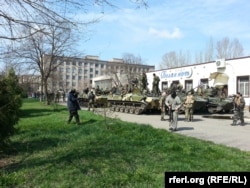Как сообщает "Остров", про-российские активисты при поддержке "зеленых человечков" (профессионально вооруженных людей без опозновательных знаков) разоружили украинских военных, а технику отогнали за пределы города. Подтверждения информации из других источников нет.