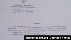 Российский спецназовец также сфотографировал "справку", выданную на его имя "Генеральной прокуратурой ДНР" 6 июля. В документе говорится, что с 1 июля по 30 октября 2015 года он "находится в составе управления специальных операций генпрокуратуры "ДНР" с правом хранения и ношения оружия".