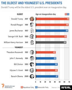 Трамп – самый пожилой президент США, 70 лет при вступлении в должность. Изучите таблицу самых молодых президентов и президентов в возрасте.