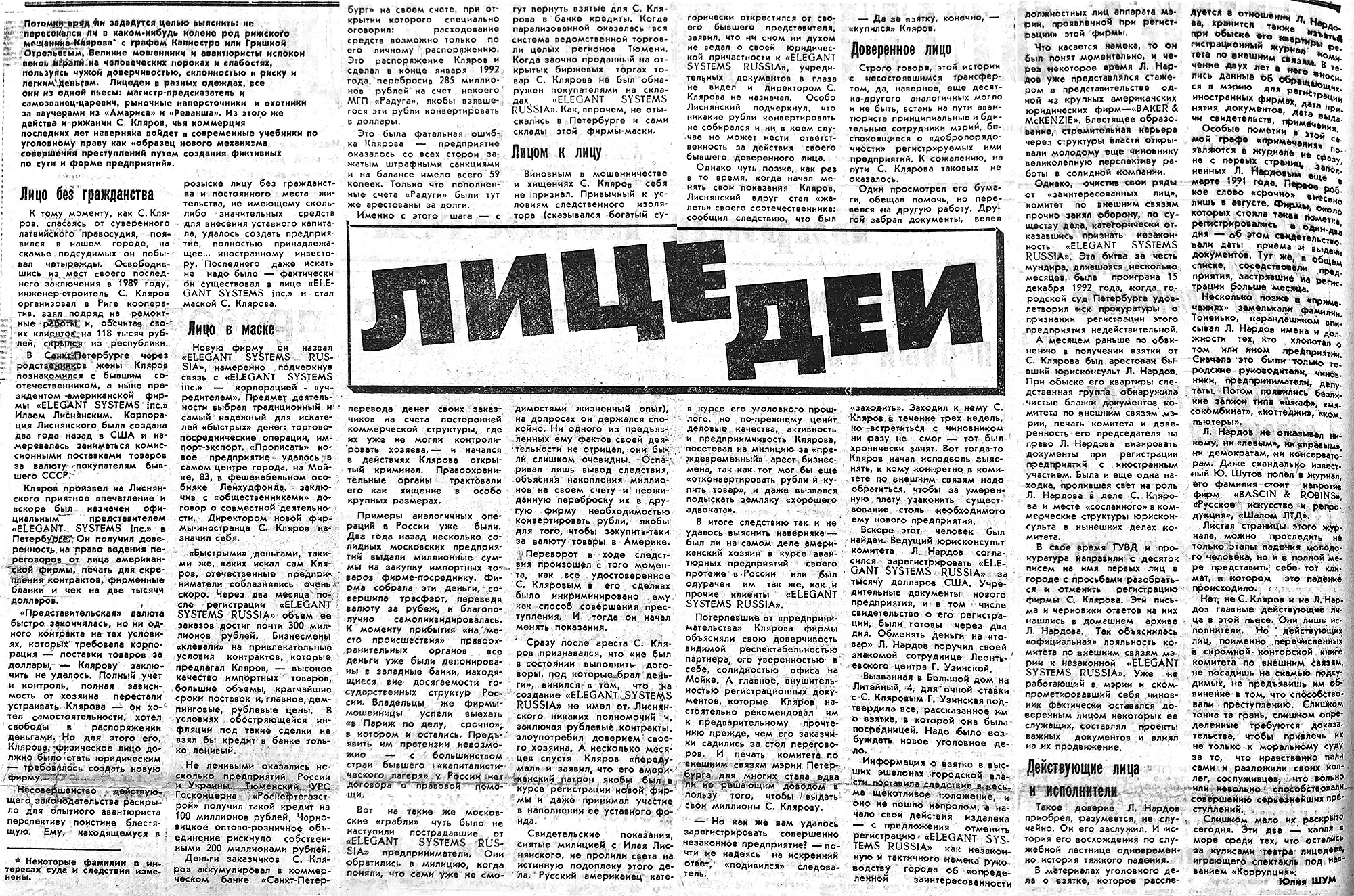 В архиве Санкт-Петербургского суда авторы расследования получили одно дело, связанное Elegant Systems Russia: 15 декабря 1992 года там рассматривалось заявление прокурора о признании незаконной регистрации этой фирмы. Прокуратура настаивала: закрыв глаза на прорехи в документах Склярова, комитет нарушил закон и поспособствовал совершению преступления.