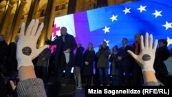 На проспекте Руставели перед зданием парламента собрались несколько тысяч человек. В руках собравшихся – флаги Грузии и Евросоюза, а также плакаты с лозунгами: "Грузия голосует за ЕС", "Санкции – Бидзине!" и другие.